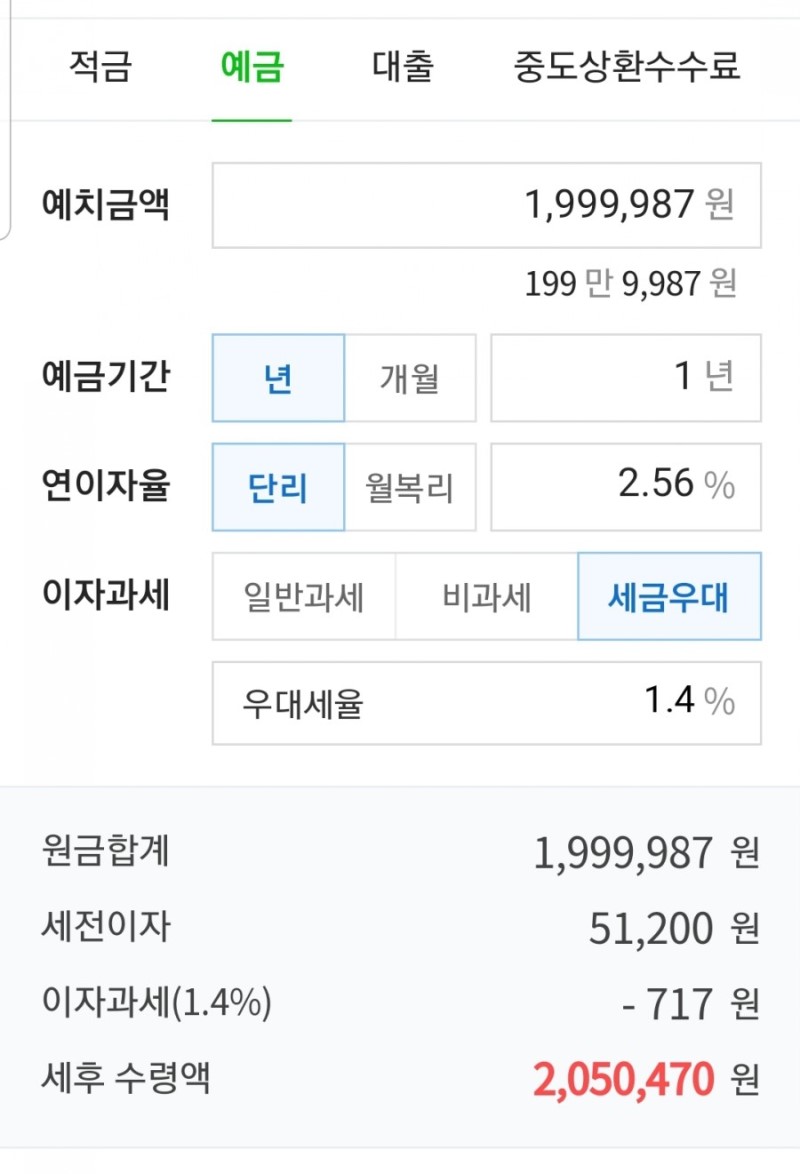1년 전에 가입한 신협 예금. 당시 이자가 2.56%였고, 제2금융권 세금우대 한도 꽉 채워서 약 200만원을 가입했다.