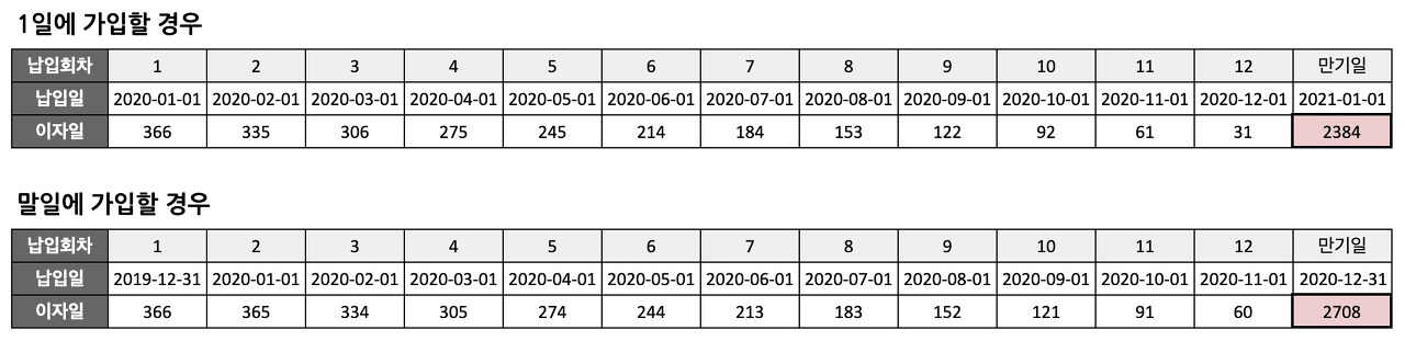 여기까기만 계산해도 이자일은 총 2,708일로 1일에 가입한 것보다 훨씬 많다.