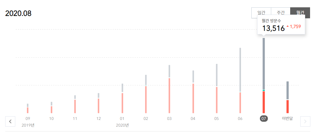 수익공개에 앞서, 내 블로그 스펙을 잠깐 보자면, 요즘들어 일방문자는 300명 정도?이고 그 전에는 100명 혹은 미만이었다. 다행히 포스팅이 쌓이면서 방문자 수는 우상향 하고 있다. 7월에는 13,516명이 방문했으니 하루에 450명이 온 셈이다.