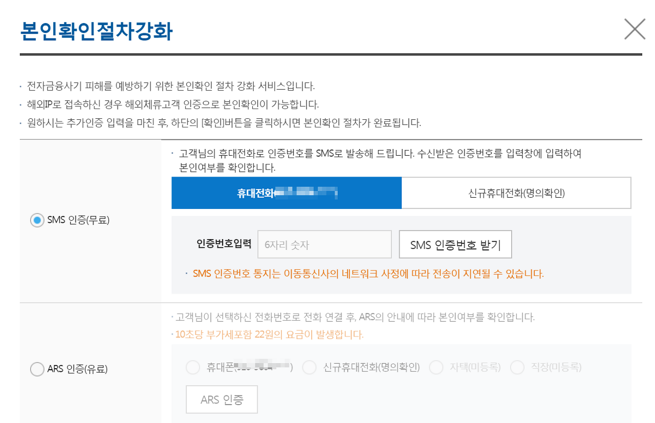 휴대폰인증 화면이 뜬다. SMS인증이 무료니까 그걸로 선택하고, 인증번호 받기 하면 문자가 온다.