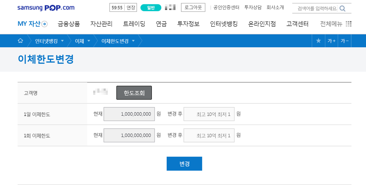 삼성증권 홈페이지 > 인터넷뱅킹 > 이체 > 이체한도변경