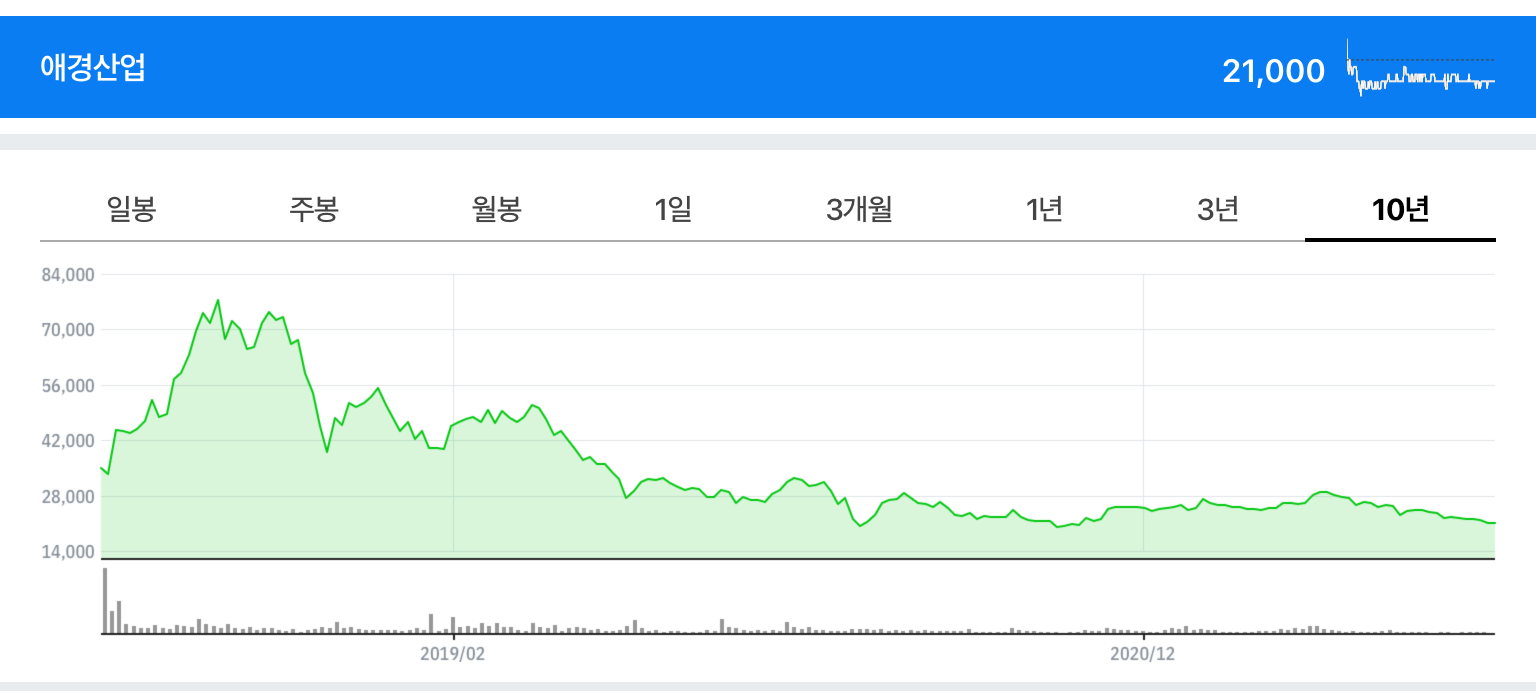 일부는 계속 보유했다. 더 오르지 않을까 라는 생각으로 가지고 있었는데 4년이 지났다. 피터린치가 말한 10루타 종목은 아니었구나. 7만원까지 갔었던 주가는 어제 종가 기준 21,000원이다. (2021. 11월)