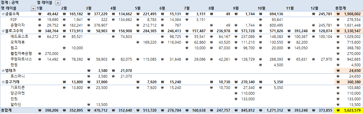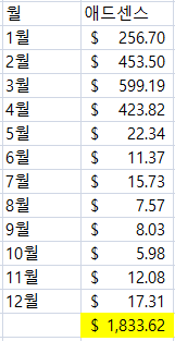 피벗테이블에 나온 금액 + 애드센스 $1833 (약 200만원)
