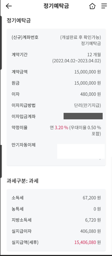나는 1500만원 탈탈 끌어모아서 가입했고 세후 이자는 40만원!