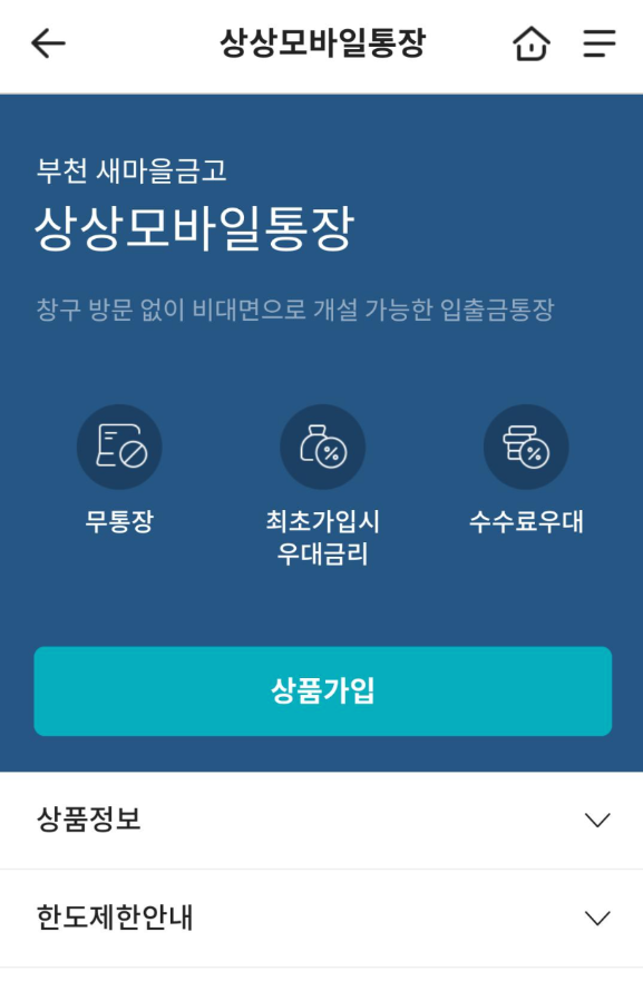 그럼 이렇게 부천 새마을금고에서 상상모바일통장 이라는 입출금통장을 비대면으로 개설할 수 있다.