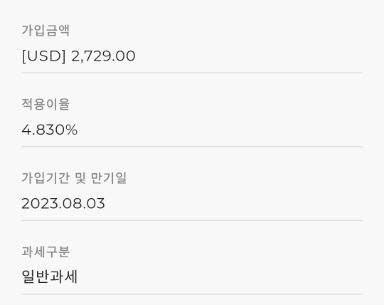 가입금액은 2729달러이고, 적용이율은 4.83%으로 지난번 정기예금보다 훨씬 높다. 만기일은 최대가 6개월이라 그렇게 했는데, 은근히 돌아오는 텀이 짧아서 만기의 재미를 쏠쏠하게 누릴 수 있다.