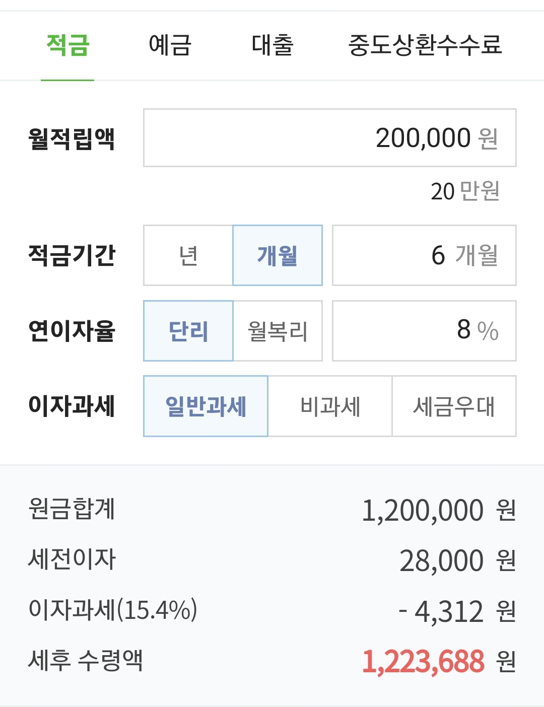 20만원씩 6개월 적금하면 최대이율 8% 적용 시 세후이자 23688원이다.