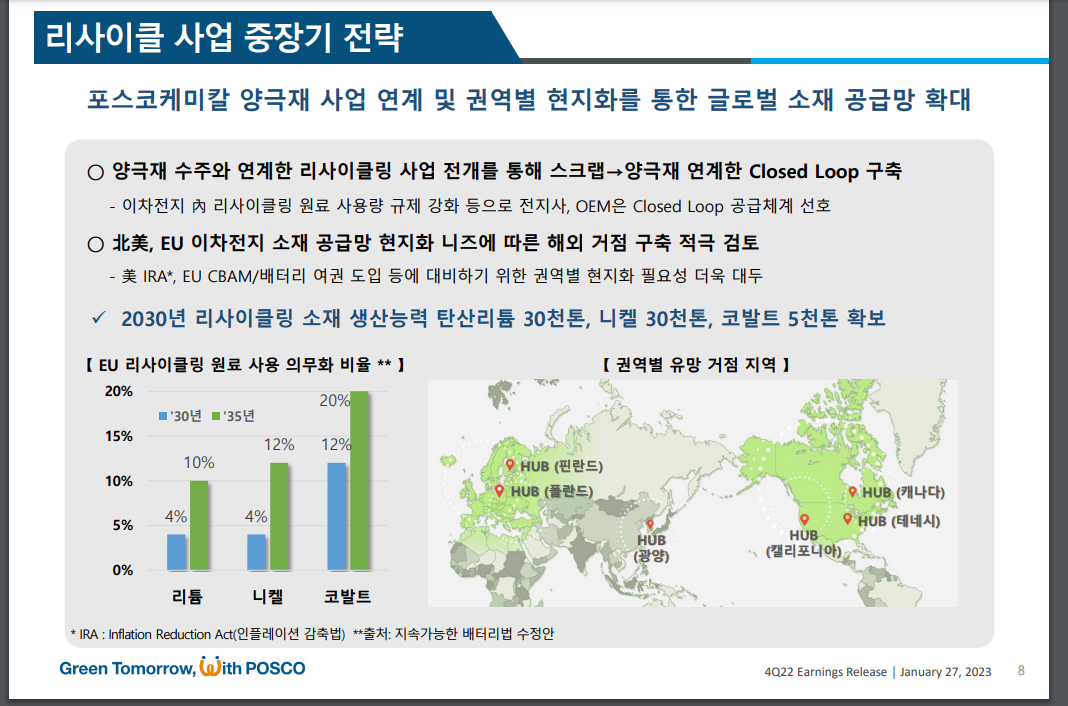 IR 자료에서도 폐배터리 리사이클 사업을 강조해서 얘기했는데, 특히 EU 리사이클링 원료 사용 의무화 비율이 높아짐에 따라 필요성이 더 대두된다.