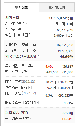 포스코홀딩스라는 종목이 생소했는데, 알고보니 철강기업 포스코를 지주회사와 다른 계열사로 나눠서 재상장한 것이었다. 현재 시총 31조로 코스피 11위이며 PER 10배, PBR 0.54배, 배당 3.21% 수준이다.