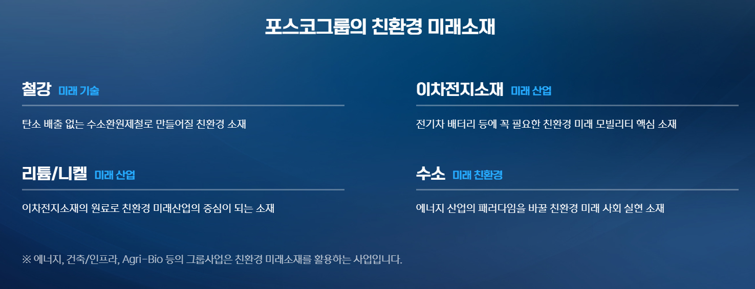 철강, 이차전지소재, 리튬/니켈, 수소가 포스코홀딩스의 주요 사업 분야이다.