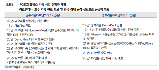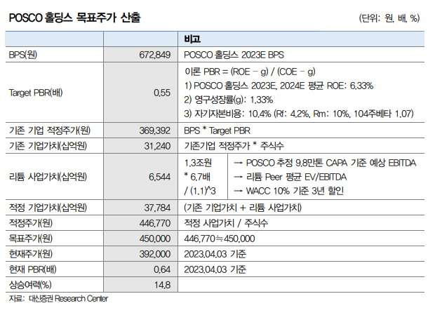 대신증권 리서치 센터 리포트에서는 목표주가는 기존사업가치에 리튬사업가치를 합산한 SOTP Valuation으로 산정하였고 투자 확정 CAPA 9.8만톤 기준 산정 2026년 리튬사업가치를 현가로 할인하여 합산했다. 이에 따라 포스코홀딩스 목표주가는 45만원으로 계산되었다.
