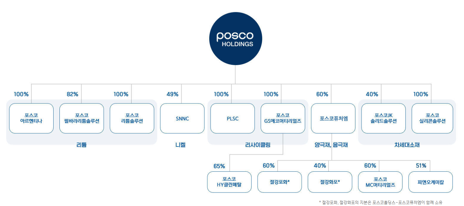 1) 소재 : 양극재와 음극재를 둘 다 생산하는 유일한 기업 (포스코퓨처엠 = 포스코케미칼, 지분 60%)