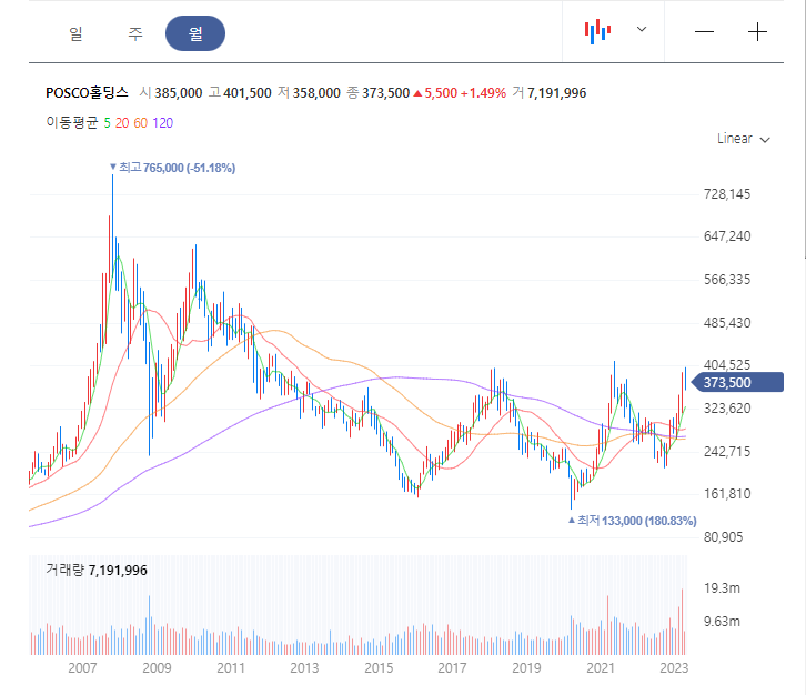 철강사업의 영향으로 월봉으로 길게 보면 시클리컬로 보인다.