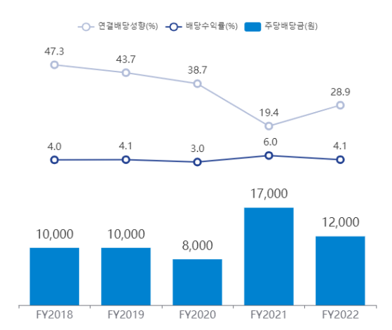 배당성향은 30%으로 매우 주주친화적인 기업이다. 심지어 지배지분 연결순이익 산정시 현금유출 없는 일회성비용 조정하겠다고 홈페이지에 명시해두었다. 또한 2020~2021년 1조 원 규모(4.5백만주, 5.1%)의 자사주 매입을 실시하였고, 2022년 6.7천억 원 규모(2.6백만주, 3.0%)의 자사주를 소각하는 등 흔치않은 주주친화적인 행보를 보이고 있다.