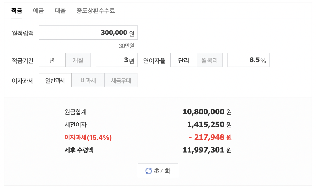 월 30만원 3년 납입 시, 금리 8.5% 기준 총 세후 이자는 119만 7301원
