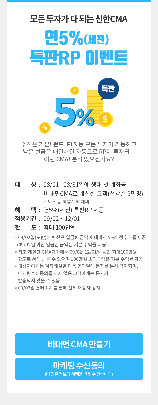이 상품은 KB증권이랑 약간 다른데, KB증권 상품은 적금처럼 월 50만원씩 불입하는 개념이고, 신한금융투자 특판RP는 CMA 계좌에 예금처럼 100만원을 거치해 놓으면 거기에 대해서 5% 이자가 발생하는 것이다. CMA 계좌에 거치한 금액을 증권사에서 여러 군데에 투자하는데 RP 상품에 투자해서 확정금리를 5%를 주겠다는 것이다. 즉, 이자는 100만원에 5% 예금 금리로 계산하면 된다.